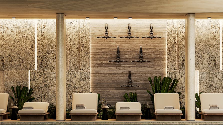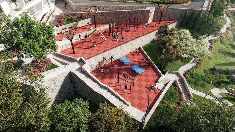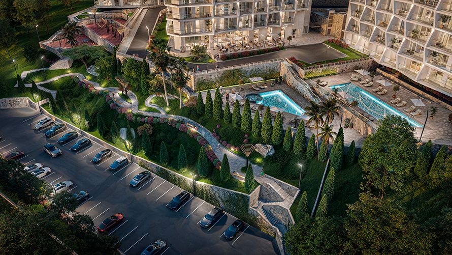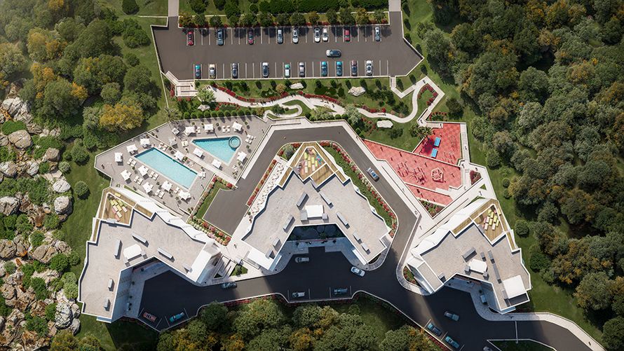 Продуманная инфраструктура – два бассейна (взрослый и детский), SPA-центр (500 м²), ресторан с террасой, тренажёрный зал, бизнес-зал, детские площадки, парковая зона и infinity-террасы на верхних этажах.